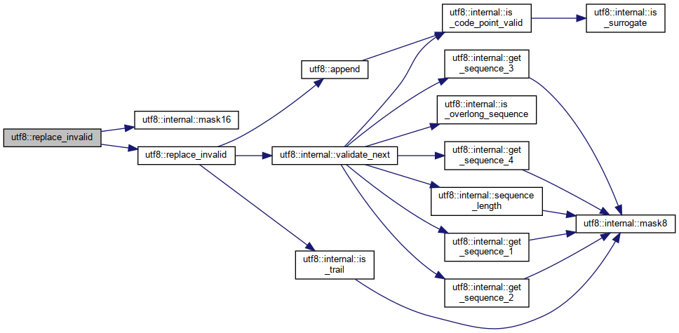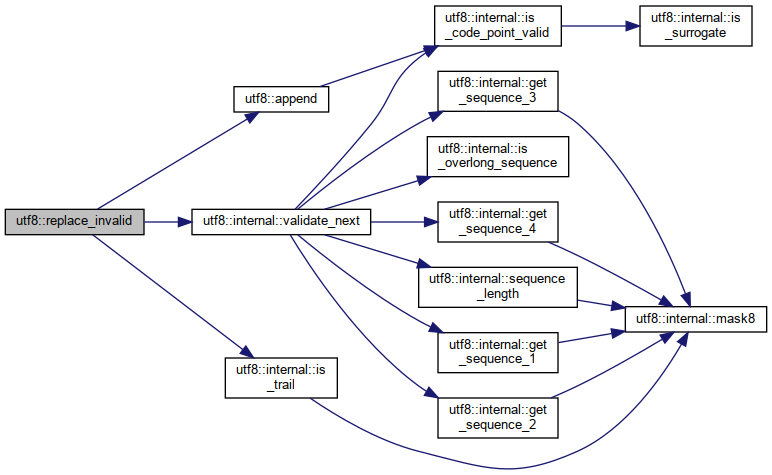 Here is the call graph for this function:| output_iterator utf8::replace_invalid | ( | octet_iterator | start, |